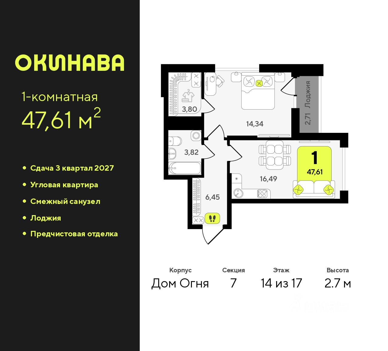 Продается однокомнатная квартира с предчистовой отделкой в ЖК "Окинава" на 14 этаже. Общая площадь: 47.61 кв.м., жилая: 14.34 кв.м., площадь просторной кухни-столовой: 16.49 кв.м. Угловая квартира, очень светлая, естественная вентиляция при открытии окон. В квартире одна лоджия, один совмещенный санузел. Высота потолков 2.7 м.
