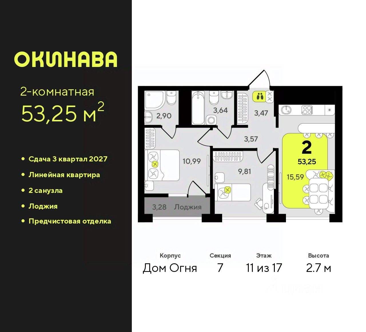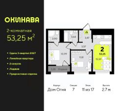 Двухкомнатная квартира с предчистовой отделкой в ЖК "Окинава" на 11 этаже. Общая площадь: 53.25 кв.м., жилая: 20.8 кв.м., площадь просторной кухни-столовой: 15.59 кв.м. Комнаты изолированные, все окна выходят на одну сторону. В квартире одна лоджия, два совмещенных санузла. Высота потолков 2.7 м.