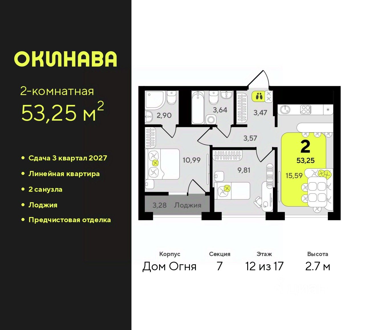 2-комн. квартира с предчистовой отделкой в ЖК "Окинава" на 12 этаже. Общая площадь: 53.25 кв.м., жилая: 20.8 кв.м., площадь просторной кухни-столовой: 15.59 кв.м. Комнаты изолированные, все окна выходят на одну сторону. В квартире одна лоджия, два совмещенных санузла. Высота потолков 2.7 м.