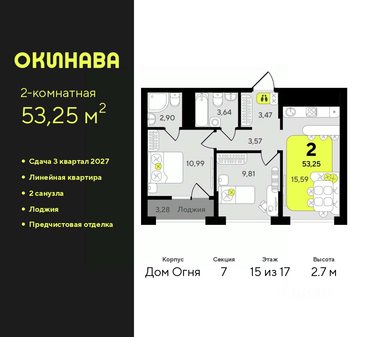 Продается двухкомнатная квартира от застройщика с предчистовой отделкой в ЖК "Окинава" на 15 этаже. Общая площадь: 53.25 кв.м., жилая: 20.8 кв.м., площадь просторной кухни-столовой: 15.59 кв.м. Комнаты изолированные, все окна выходят на одну сторону. В квартире одна лоджия, два совмещенных санузла. Высота потолков 2.7 м.
