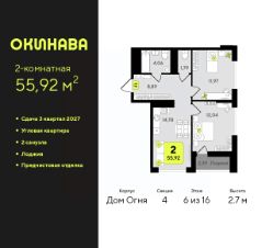 2-комн. квартира с предчистовой отделкой в ЖК "Окинава" на 6 этаже. Общая площадь: 55.92 кв.м., жилая: 24.01 кв.м., площадь просторной кухни-столовой: 14.78 кв.м. Угловая квартира, очень светлая, естественная вентиляция при открытии окон. В квартире одна лоджия, один совмещенный и один раздельный санузел. Высота потолков 2.7 м.