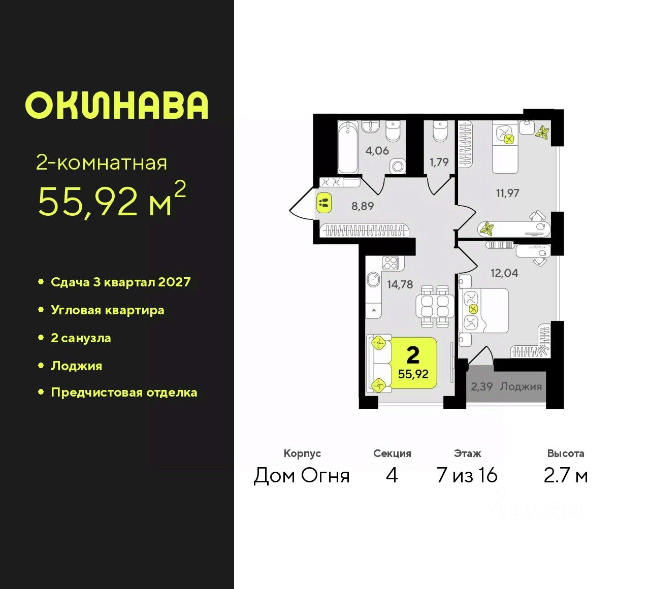 Двухкомнатная квартира с предчистовой отделкой в ЖК "Окинава" на 7 этаже. Общая площадь: 55.92 кв.м., жилая: 24.01 кв.м., площадь просторной кухни-столовой: 14.78 кв.м. Квартира угловая, окна oбecпeчивaют paвнoмepнoe ocвeщeниe в тeчeниe дня. В квартире одна лоджия, один совмещенный и один раздельный санузел. Высота потолков 2.7 м.