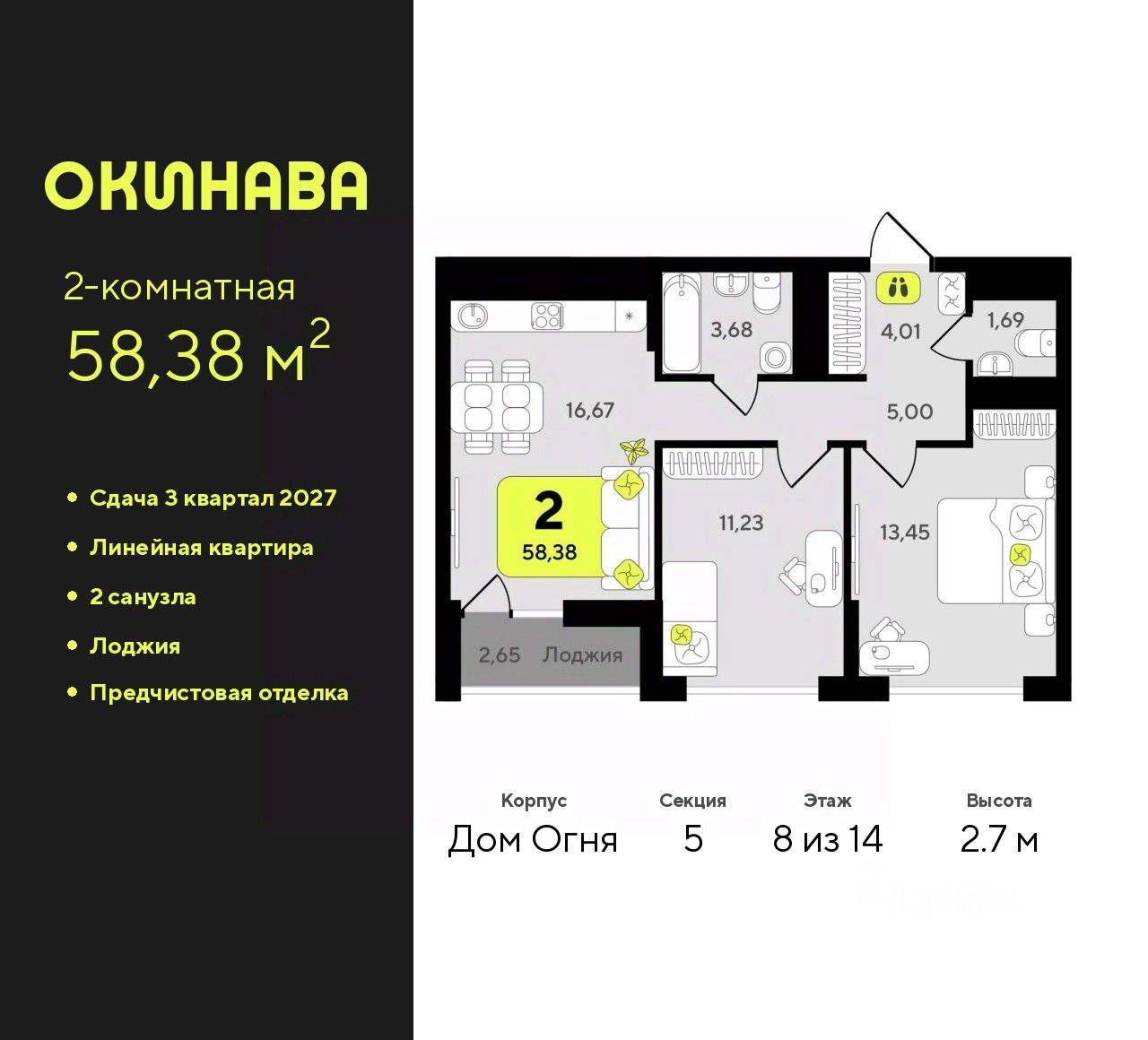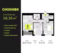 2-комн. квартира с предчистовой отделкой в ЖК "Окинава" на 8 этаже. Общая площадь: 58.38 кв.м., жилая: 24.68 кв.м., площадь просторной кухни-столовой: 16.67 кв.м. Комнаты изолированные, все окна выходят на одну сторону. В квартире одна лоджия, один совмещенный и один раздельный санузел. Высота потолков 2.7 м.