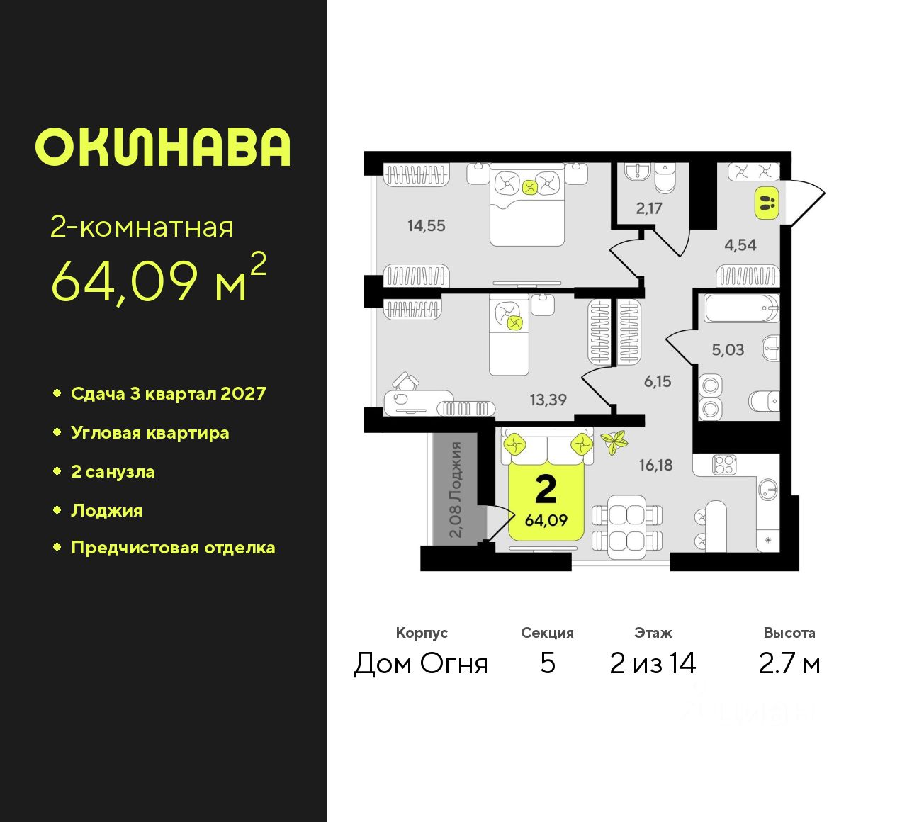 2-комн. квартира с предчистовой отделкой в ЖК "Окинава" на 2 этаже. Общая площадь: 64.09 кв.м., жилая: 27.94 кв.м., площадь просторной кухни-столовой: 16.18 кв.м. Квартира угловая, идеально подойдет любителям тишины и панорамных видов. В квартире одна лоджия, один совмещенный и один раздельный санузел. Высота потолков 2.7 м.
