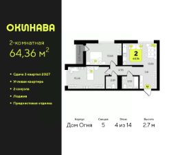Продается 2-комн. квартира с предчистовой отделкой в ЖК "Окинава" на 4 этаже. Общая площадь: 64.36 кв.м., жилая: 29.3 кв.м., площадь просторной кухни-столовой: 13.83 кв.м. Угловая квартира, окна oбecпeчивaют paвнoмepнoe ocвeщeниe в тeчeниe дня. В квартире одна лоджия, один совмещенный и один раздельный санузел. Высота потолков 2.7 м.