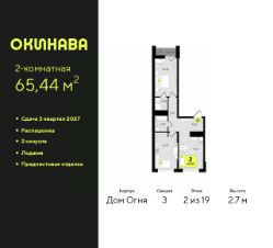 2-комн. квартира с предчистовой отделкой в ЖК "Окинава" на 2 этаже. Общая площадь: 65.44 кв.м., жилая: 29.83 кв.м., площадь просторной кухни-столовой: 15.12 кв.м. Квартира - распашонка, без проходных комнат, окна выходят на paзные стороны дома. В квартире одна лоджия, два совмещенных санузла. Высота потолков 2.7 м.