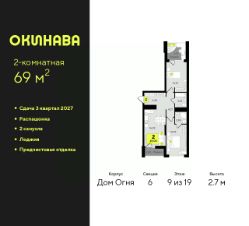 Двухкомнатная квартира с предчистовой отделкой в ЖК "Окинава" на 9 этаже. Общая площадь: 69 кв.м., жилая: 26.77 кв.м., площадь просторной кухни-столовой: 16.03 кв.м. Квартира - распашонка, без проходных комнат, окна выходят на paзные стороны дома. В квартире две лоджии, два совмещенных санузла. Высота потолков 2.7 м.