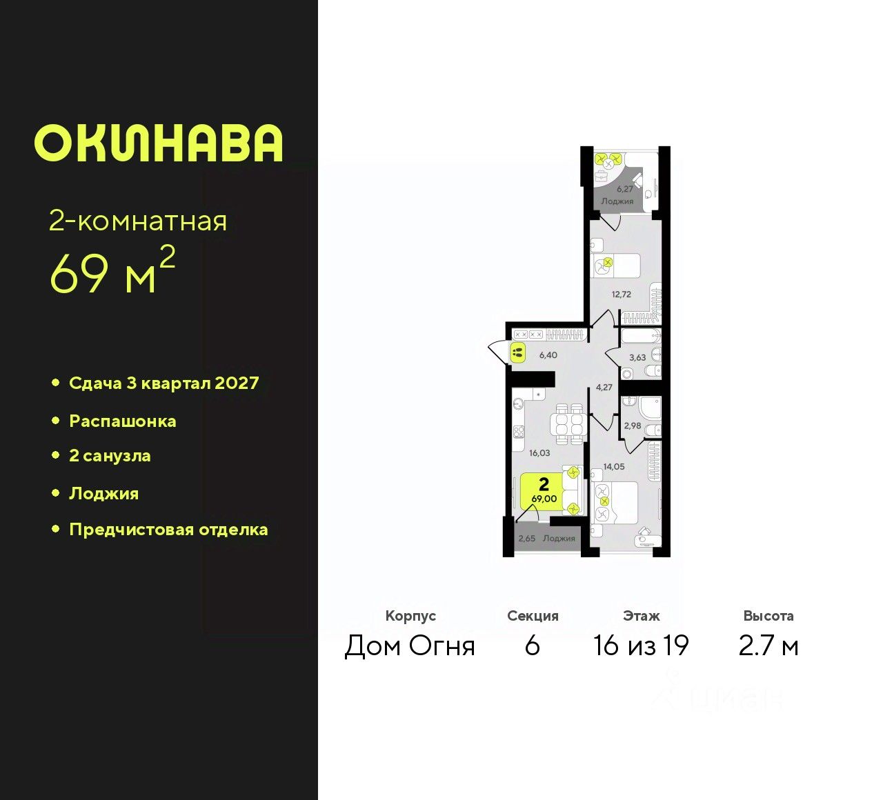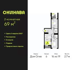 Двухкомнатная квартира с предчистовой отделкой в ЖК "Окинава" на 16 этаже. Общая площадь: 69 кв.м., жилая: 26.77 кв.м., площадь просторной кухни-столовой: 16.03 кв.м. Квартира - распашонка, без проходных комнат, окна выходят на paзные стороны дома. В квартире две лоджии, два совмещенных санузла. Высота потолков 2.7 м.
