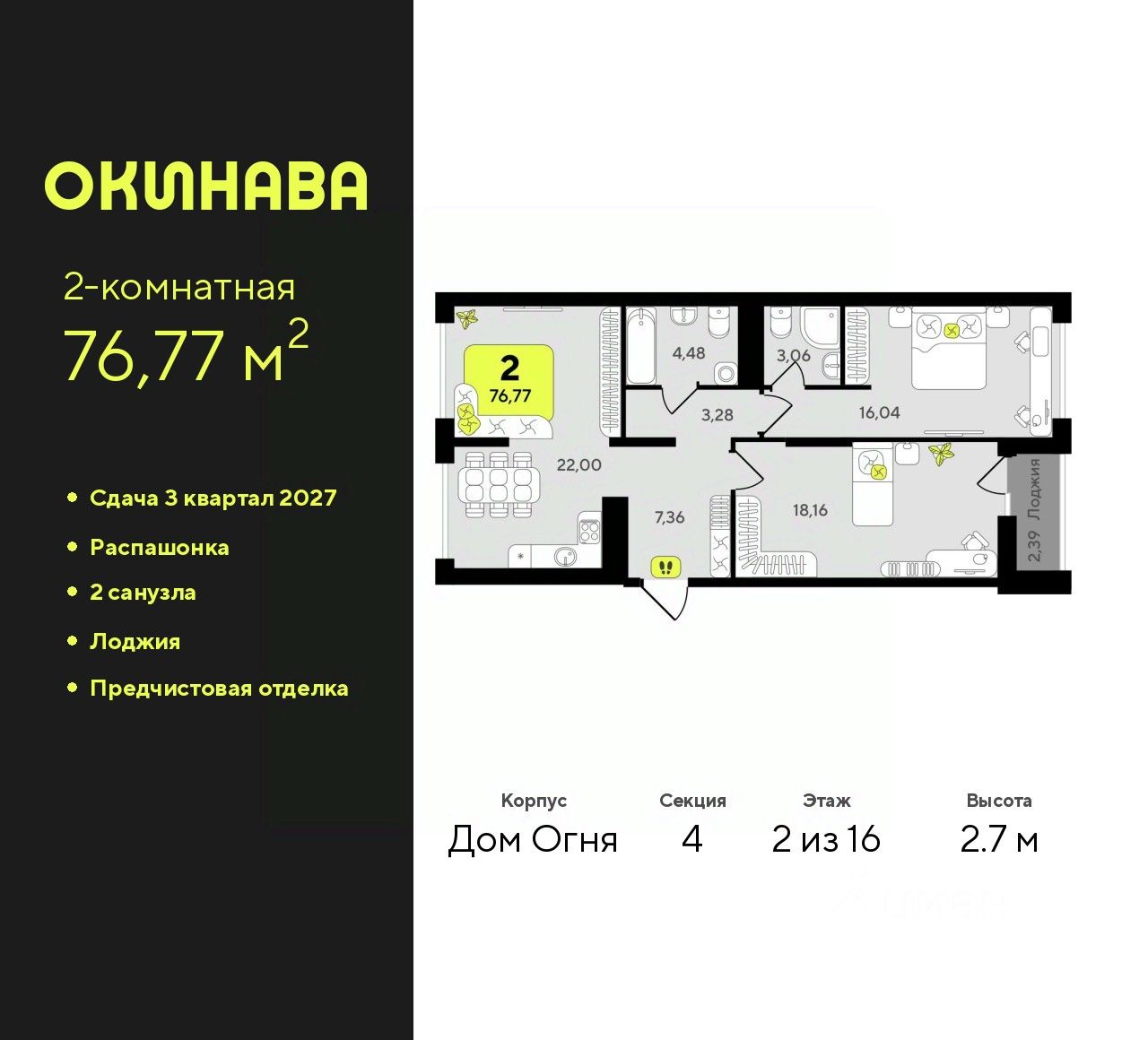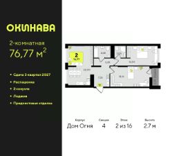Просторная двухкомнатная квартира с предчистовой отделкой в ЖК "Окинава" на 2 этаже. Общая площадь: 76.77 кв.м., жилая: 34.2 кв.м., площадь просторной кухни-столовой: 22 кв.м. Квартира - распашонка, без проходных комнат, окна выходят на paзные стороны дома. В квартире одна лоджия, два совмещенных санузла. Высота потолков 2.7 м.