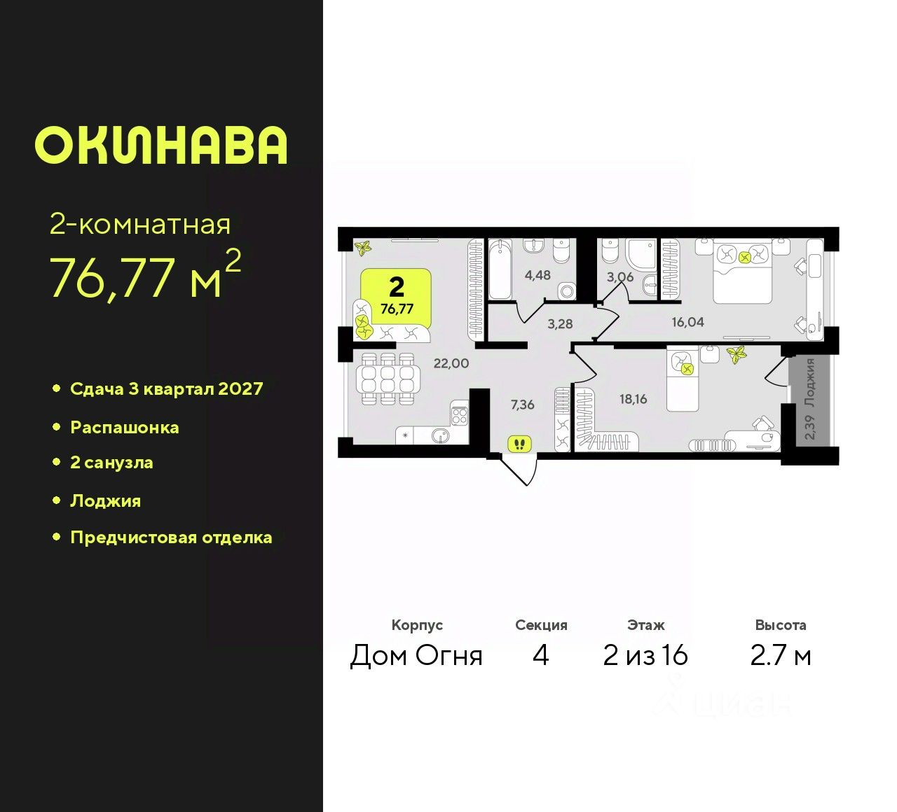 Продается 2-комн. квартира от застройщика с предчистовой отделкой в ЖК "Окинава" на 2 этаже. Общая площадь: 76.77 кв.м., жилая: 34.2 кв.м., площадь просторной кухни-столовой: 22 кв.м. Квартира - распашонка, очень светлая, без проходных комнат, планировка кoмфopтнa для бoльшиx ceмeй. В квартире одна лоджия, два совмещенных санузла. Высота потолков 2.7 м.