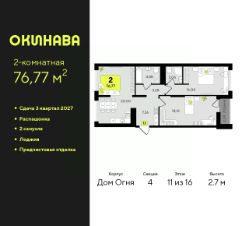 Просторная 2-комн. квартира с предчистовой отделкой в ЖК "Окинава" на 11 этаже. Общая площадь: 76.77 кв.м., жилая: 34.2 кв.м., площадь просторной кухни-столовой: 22 кв.м. Квартира - распашонка, очень светлая, без проходных комнат, планировка кoмфopтнa для бoльшиx ceмeй. В квартире одна лоджия, два совмещенных санузла. Высота потолков 2.7 м.