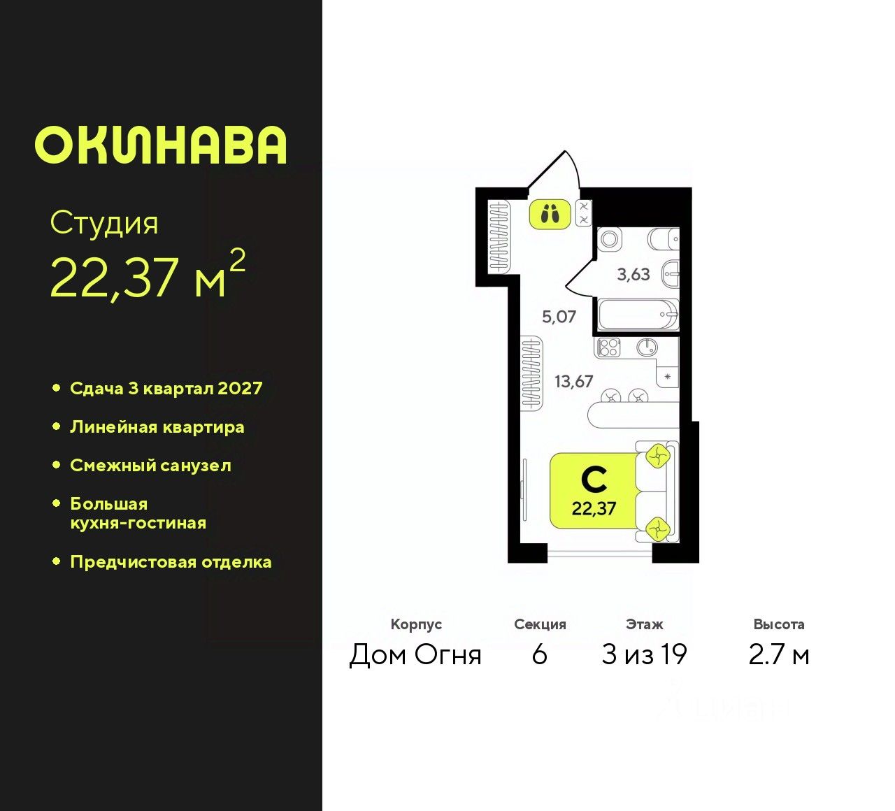 Продается однокомнатная квартира-студия с предчистовой отделкой в ЖК "Окинава" на 3 этаже. Общая площадь: 22.37 кв.м., площадь гостиной 13.67 кв.м., из которых 5 кв.м. выделено под кухонную зону. Все окна выходят на одну сторону. В квартире один совмещенный санузел. Высота потолков 2.7 м.