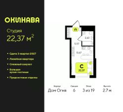 1-комн. квартира-студия от застройщика с предчистовой отделкой в ЖК "Окинава" на 3 этаже. Общая площадь: 22.37 кв.м., площадь гостиной 13.67 кв.м., из которых 5 кв.м. выделено под кухонную зону. Все окна выходят на одну сторону. В квартире один совмещенный санузел. Высота потолков 2.7 м.