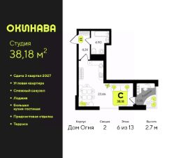 Однокомнатная квартира-студия от застройщика с предчистовой отделкой в ЖК "Окинава" на 6 этаже. Общая площадь: 38.18 кв.м., площадь гостиной 23.66 кв.м., из которых 10 кв.м. выделено под кухонную зону. Квартира угловая, идеально подойдет любителям тишины и панорамных видов. В квартире одна лоджия, один совмещенный санузел. Наличие террасы в квартире открывает возможность для обустройства дополнительной площади. Высота потолков 2.7 м.