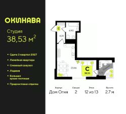 Просторная однокомнатная квартира-студия с предчистовой отделкой в ЖК "Окинава" на 12 этаже. Общая площадь: 38.53 кв.м., площадь гостиной 23.66 кв.м., из которых 5 кв.м. выделено под кухонную зону. Все окна выходят на одну сторону. В квартире одна лоджия, один совмещенный санузел. Высота потолков 2.7 м.