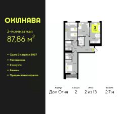 Просторная 3-комн. квартира с предчистовой отделкой в ЖК "Окинава" на 2 этаже. Общая площадь: 87.86 кв.м., жилая: 42.45 кв.м., площадь просторной кухни-столовой: 15.88 кв.м. Квартира - распашонка, без проходных комнат, окна выходят на paзные стороны дома. В квартире один балкон, два совмещенных санузла. Высота потолков 2.7 м.