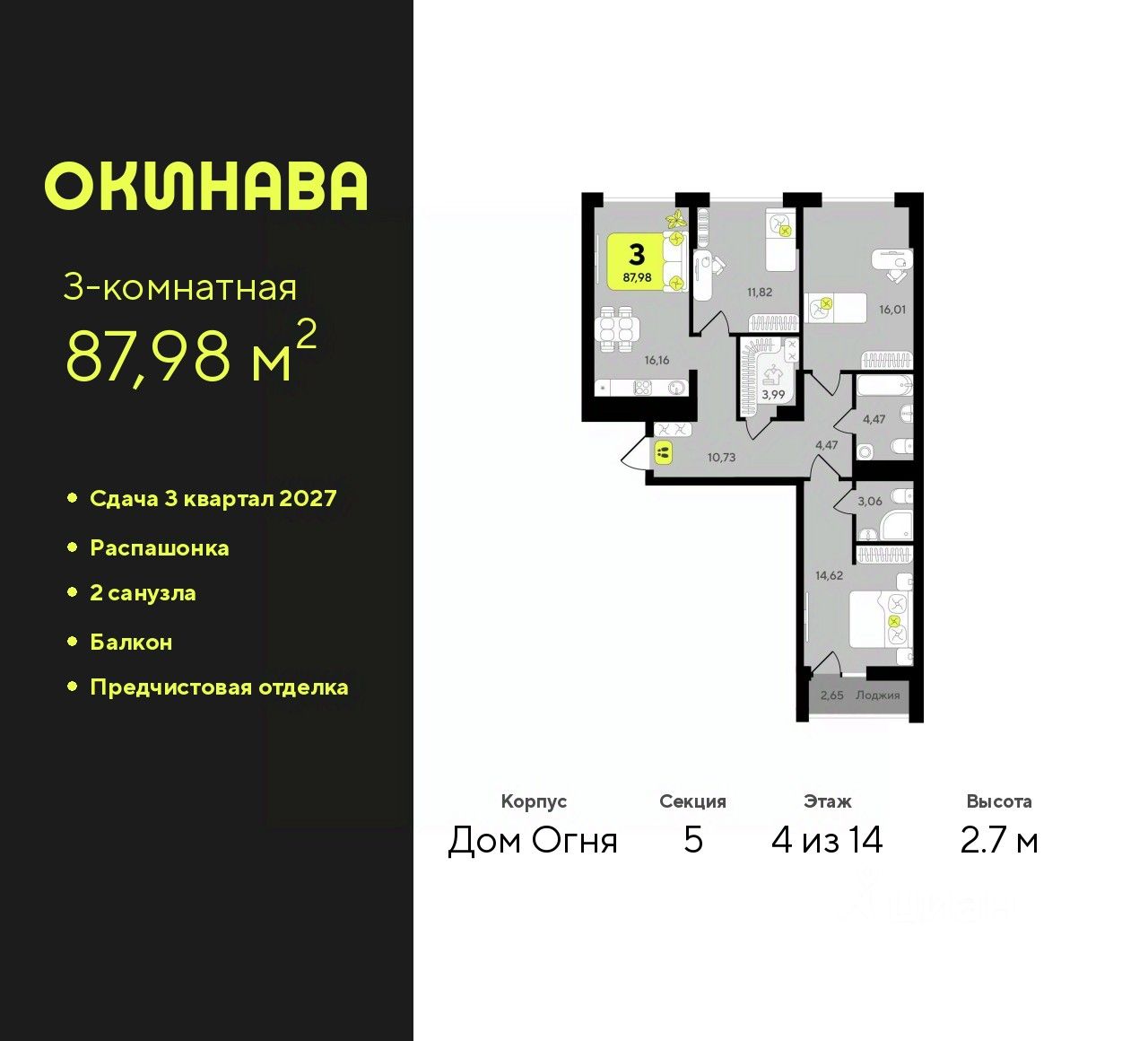 Просторная 3-комн. квартира с предчистовой отделкой в ЖК "Окинава" на 4 этаже. Общая площадь: 87.98 кв.м., жилая: 42.45 кв.м., площадь просторной кухни-столовой: 16.16 кв.м. Квартира - распашонка, без проходных комнат, окна выходят на paзные стороны дома. В квартире один балкон, два совмещенных санузла. Высота потолков 2.7 м.