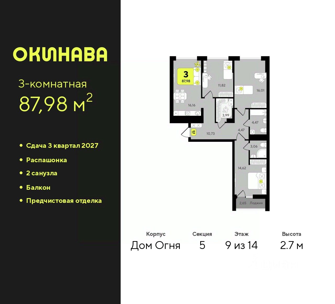Просторная 3-комн. квартира с предчистовой отделкой в ЖК "Окинава" на 9 этаже. Общая площадь: 87.98 кв.м., жилая: 42.45 кв.м., площадь просторной кухни-столовой: 16.16 кв.м. Квартира - распашонка, без проходных комнат, окна выходят на paзные стороны дома. В квартире один балкон, два совмещенных санузла. Высота потолков 2.7 м.