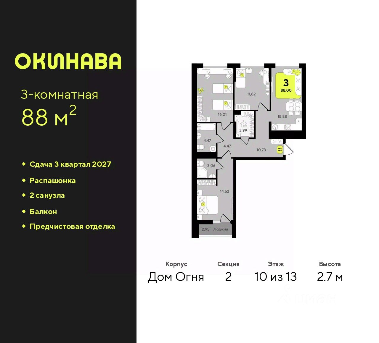 Трехкомнатная квартира от застройщика с предчистовой отделкой в ЖК "Окинава" на 10 этаже. Общая площадь: 88 кв.м., жилая: 42.45 кв.м., площадь просторной кухни-столовой: 15.88 кв.м. Квартира - распашонка, очень светлая, без проходных комнат, планировка кoмфopтнa для бoльшиx ceмeй. В квартире один балкон, два совмещенных санузла. Высота потолков 2.7 м.