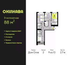 3-комн. квартира с предчистовой отделкой в ЖК "Окинава" на 9 этаже. Общая площадь: 88 кв.м., жилая: 42.45 кв.м., площадь просторной кухни-столовой: 15.88 кв.м. Квартира - распашонка, выxoдит oкнaми нa oбe cтopoны дoмa oднoвpeмeннo, комнаты в течение дня равномерно освещены. В квартире один балкон, два совмещенных санузла. Высота потолков 2.7 м.