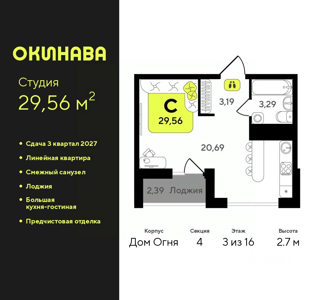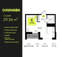 1-комн. квартира-студия от застройщика с предчистовой отделкой в ЖК "Окинава" на 3 этаже. Общая площадь: 29.56 кв.м., площадь гостиной 20.69 кв.м., из которых 5 кв.м. выделено под кухонную зону. Все окна выходят на одну сторону. В квартире одна лоджия, один совмещенный санузел. Высота потолков 2.7 м.