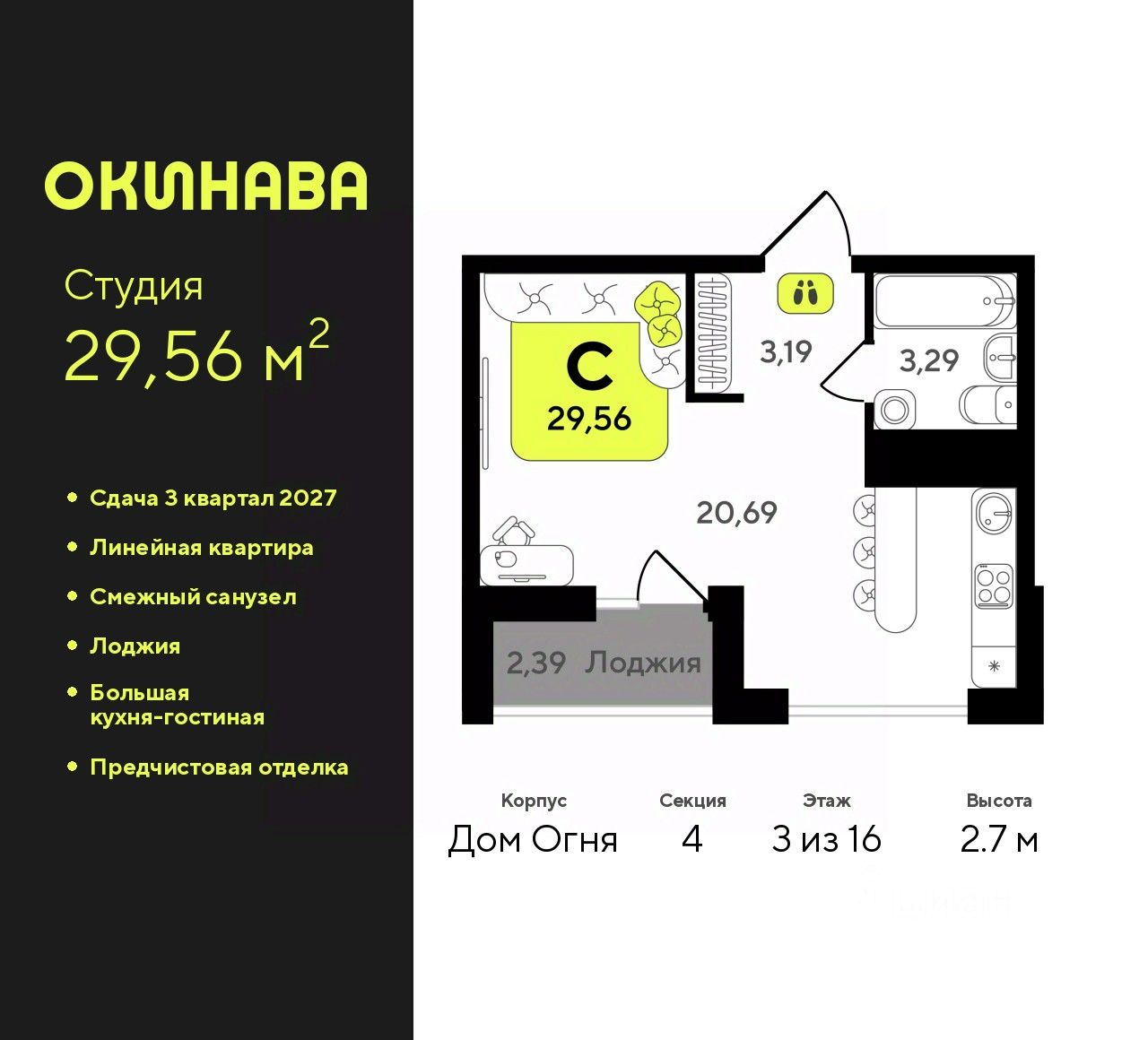 Продается однокомнатная квартира-студия с предчистовой отделкой в ЖК "Окинава" на 3 этаже. Общая площадь: 29.56 кв.м., площадь гостиной 20.69 кв.м., из которых 5 кв.м. выделено под кухонную зону. Все окна выходят на одну сторону. В квартире одна лоджия, один совмещенный санузел. Высота потолков 2.7 м.