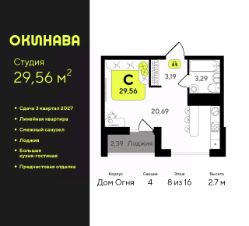 Продается 1-комн. квартира-студия с предчистовой отделкой в ЖК "Окинава" на 8 этаже. Общая площадь: 29.56 кв.м., площадь гостиной 20.69 кв.м., из которых 5 кв.м. выделено под кухонную зону. Все окна выходят на одну сторону. В квартире одна лоджия, один совмещенный санузел. Высота потолков 2.7 м.