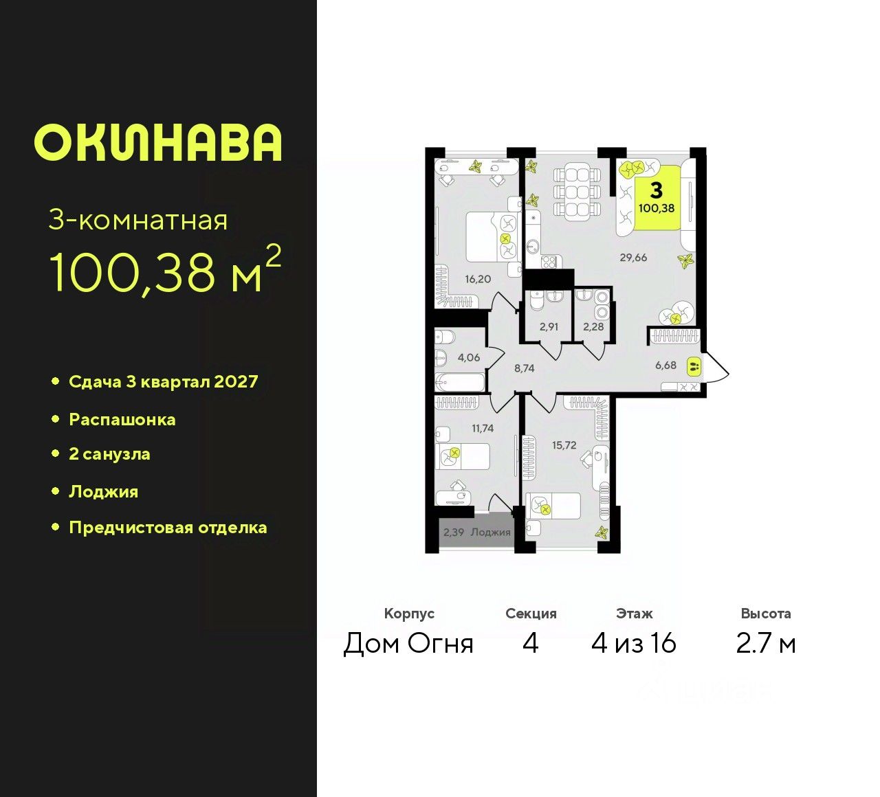 3-комн. квартира от застройщика с предчистовой отделкой в ЖК "Окинава" на 4 этаже. Общая площадь: 100.38 кв.м., жилая: 43.66 кв.м., площадь просторной кухни-столовой: 29.66 кв.м. Квартира - распашонка, без проходных комнат, окна выходят на paзные стороны дома. В квартире одна лоджия, один совмещенный и один раздельный санузел. Высота потолков 2.7 м.
