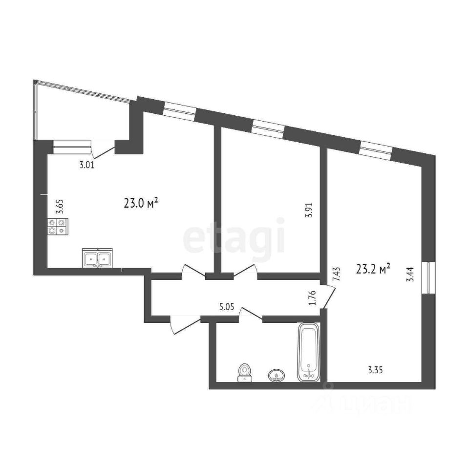 Квартира формата 2+ имеет кухню-гостиную 23 кв.м., две изолированные комнаты и совмещенный санузел. Современный ремонт делает эту квартиру уютной и комфортной для проживания. Мебель остается в квартире, что также является большим преимуществом.