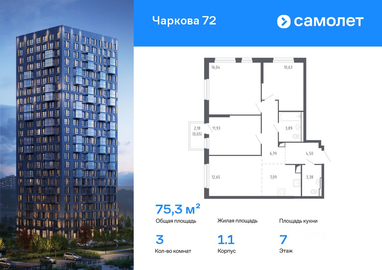 Строим кварталы для жизни с заботой о будущем. Предлагается 3-комнатная квартира комфорт-класса 76 кв.м в корпусе 1.1 на 7 этаже, в ЖК "Чаркова 72"