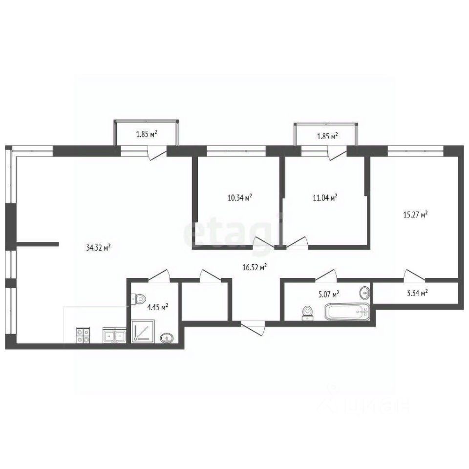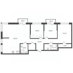 Планировка включает в себя просторная кухня-гостиная 34,32 м²,