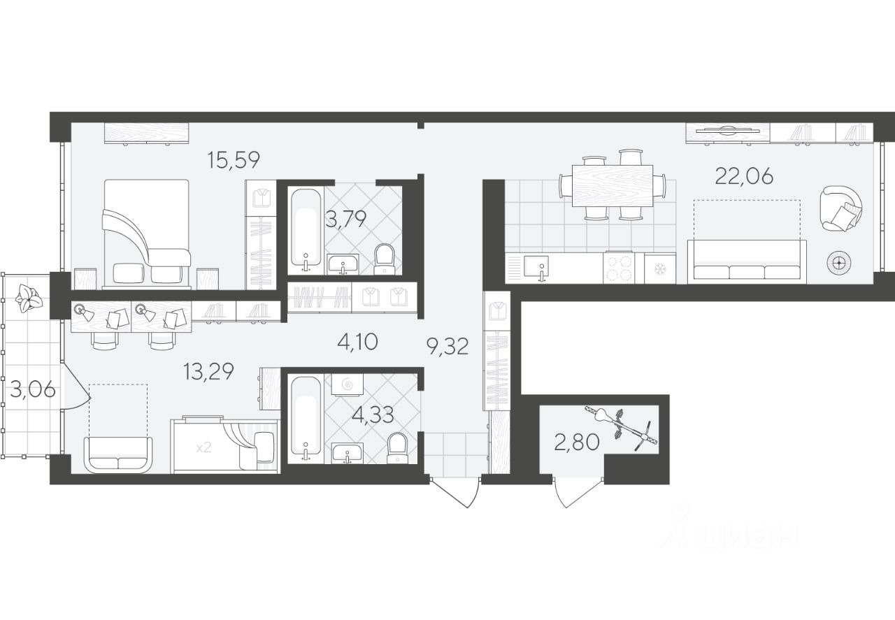 Квартира с 2 спальнями площадью 78,34 кв.м