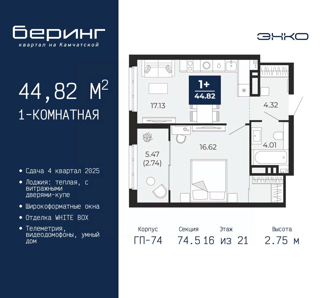 Однокомнатная квартира в ЖК "Беринг" на 16 этаже. Квартира без отделки, новый владелец может сделать ремонт по индивидуальному проекту. Общая площадь: 44.82 кв.м., жилая: 16.62 кв.м., площадь просторной кухни-столовой: 17.13 кв.м. Все окна выходят на одну сторону. В квартире одна лоджия, один совмещенный санузел. Высота потолков 2.75 м.