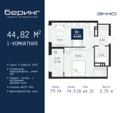 Однокомнатная квартира в ЖК "Беринг" на 16 этаже. Квартира без отделки, после выдачи ключей можно делать ремонт. Общая площадь: 44.82 кв.м., жилая: 16.62 кв.м., площадь просторной кухни-столовой: 17.13 кв.м. Все окна выходят на одну сторону. В квартире одна лоджия, один совмещенный санузел. Высота потолков 2.75 м.