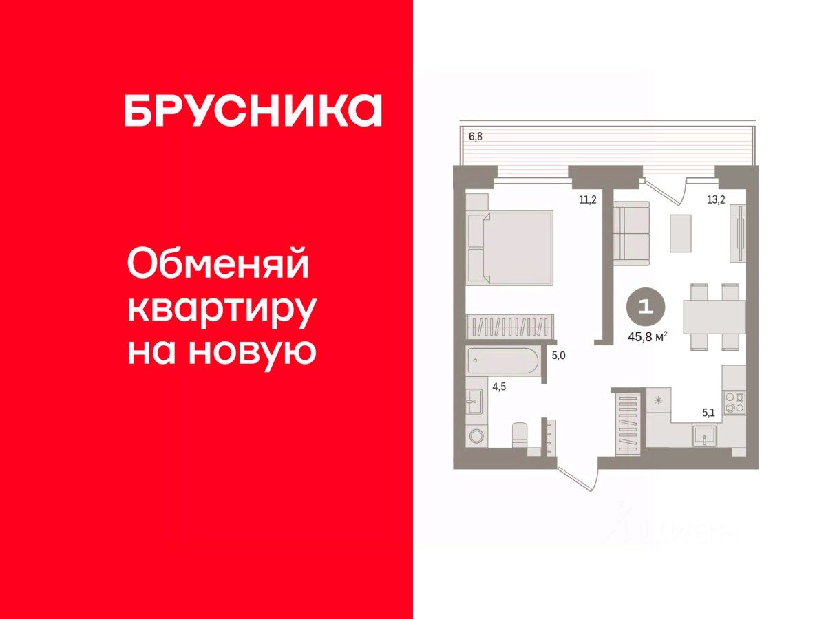 Квартира с кухней-гостиной и одной спальней в жилом районе "Речной порт". Особенности планировки: балкон, предчистовая отделка.