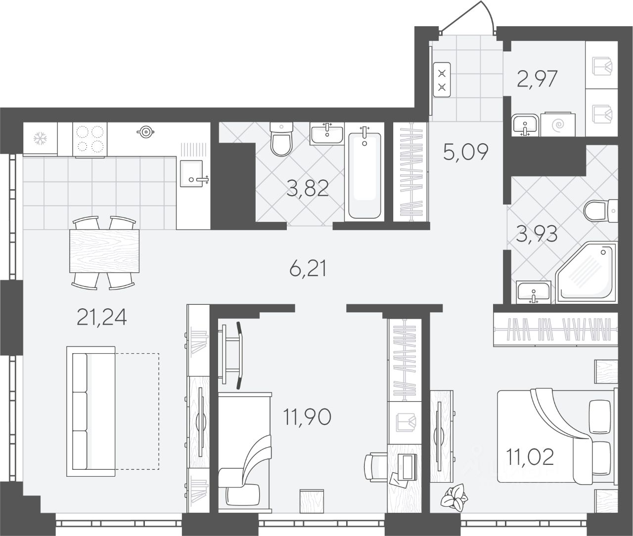 Квартира с двумя спальнями площадью 66.18 кв.м на 12 этаже с продуманной планировкой. Площадь квартиры условно разделена на гостевую зону и личное пространство только для вас и вашей семьи.
