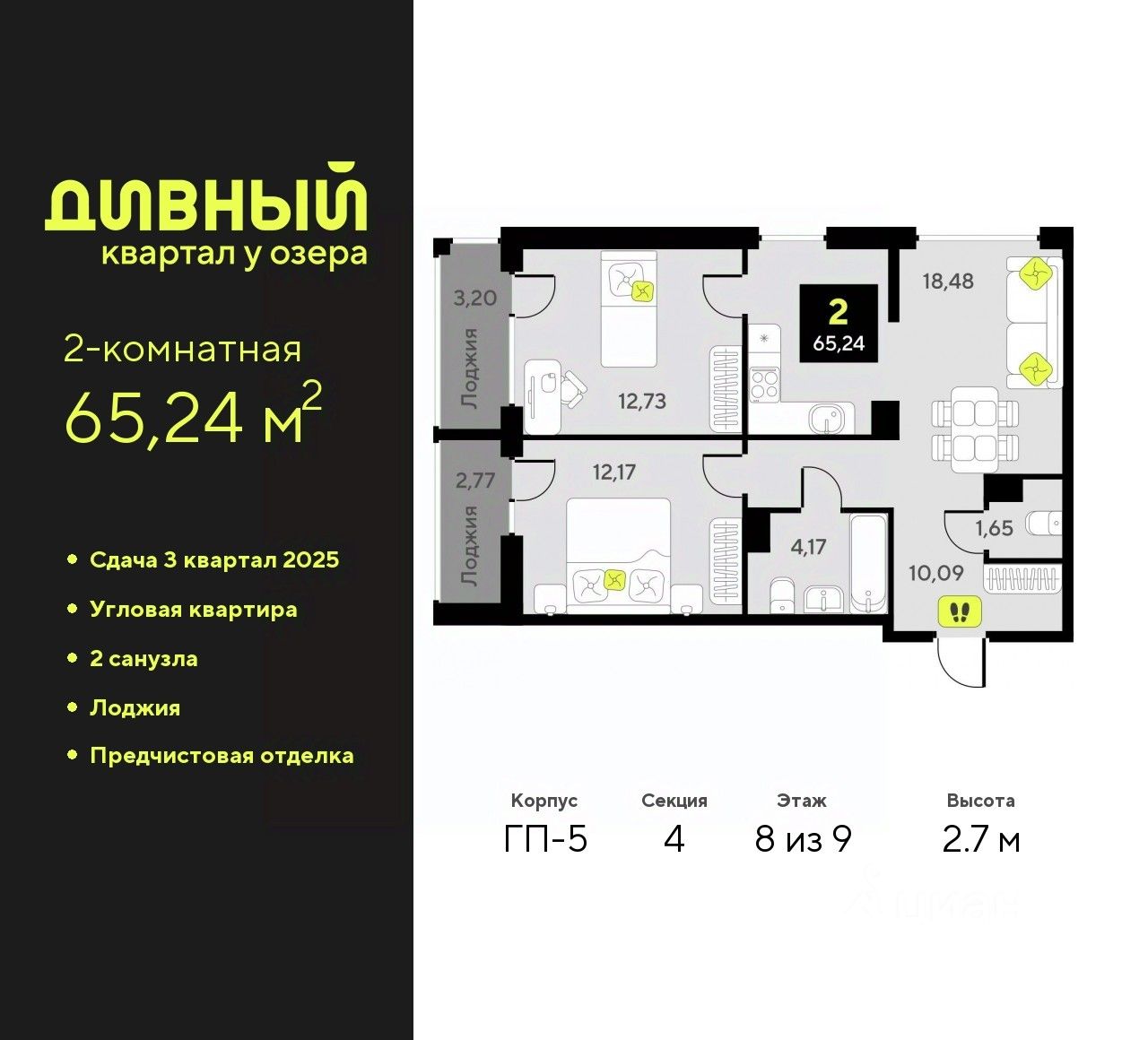 Просторная 2-комн. квартира с предчистовой отделкой в ЖК "Дивный квартал у озера" на 8 этаже. Общая площадь: 65.24 кв.м., жилая: 24.9 кв.м., площадь просторной кухни-столовой: 18.48 кв.м. Квартира угловая, идеально подойдет любителям тишины и панорамных видов. В квартире две лоджии, один совмещенный и один раздельный санузел. Высота потолков 2.7 м.