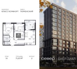 Продаётся квартира площадью 71.20 м2 в жилом комплексе "Дабл-Дабл". Квартира находится на 10 этаже, жилая площадь квартиры 31.80 м2, площадь просторной кухни — 16.90 м2. Среди особенностей планировки — изолированные комнаты с окнами на одну сторону, 1 совмещённый санузел.