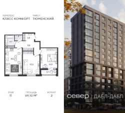 Продаётся квартира площадью 69.10 м2 в жилом комплексе "Дабл-Дабл". Квартира находится на 11 этаже, жилая площадь квартиры 29.00 м2, площадь просторной кухни — 18.20 м2. Среди особенностей планировки — изолированные комнаты с окнами на одну сторону, 1 совмещённый санузел.
