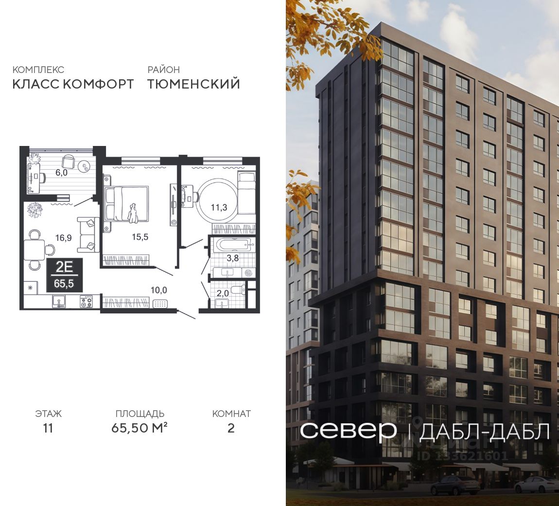 Продаётся квартира площадью 65.50 м2 в жилом комплексе "Дабл-Дабл". Квартира находится на 11 этаже, жилая площадь квартиры 26.80 м2, площадь просторной кухни — 16.90 м2. Среди особенностей планировки — изолированные комнаты с окнами на одну сторону, 1 совмещённый санузел.