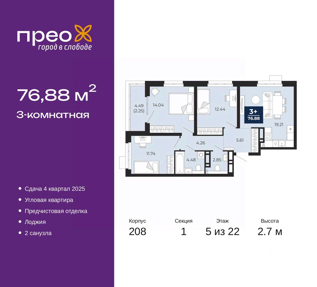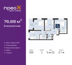 Просторная 3-комн. квартира с предчистовой отделкой в ЖК "Прео" на 5 этаже. Общая площадь: 76.88 кв.м., жилая: 38.22 кв.м., площадь просторной кухни-столовой: 19.21 кв.м. Угловая квартира, идеально подойдет любителям тишины и панорамных видов. В квартире одна лоджия, один совмещенный и один раздельный санузел. Высота потолков 2.7 м.