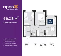 Просторная 2-комн. квартира с предчистовой отделкой в ЖК "Прео" на 5 этаже. Общая площадь: 56.08 кв.м., жилая: 22.33 кв.м., площадь просторной кухни-столовой: 16.04 кв.м. Комнаты изолированные, все окна выходят на одну сторону. В квартире один раздельный санузел. Высота потолков 2.7 м.