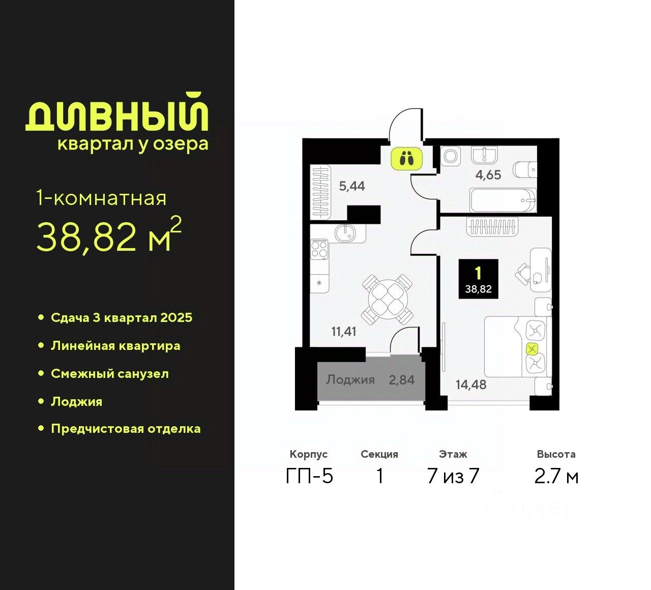 Продается однокомнатная квартира от застройщика с предчистовой отделкой в ЖК "Дивный квартал у озера" на 7 этаже. Общая площадь: 38.82 кв.м., жилая: 14.48 кв.м., площадь просторной кухни-столовой: 11.41 кв.м. Все окна выходят на одну сторону. В квартире одна лоджия, один совмещенный санузел. Высота потолков 2.7 м.