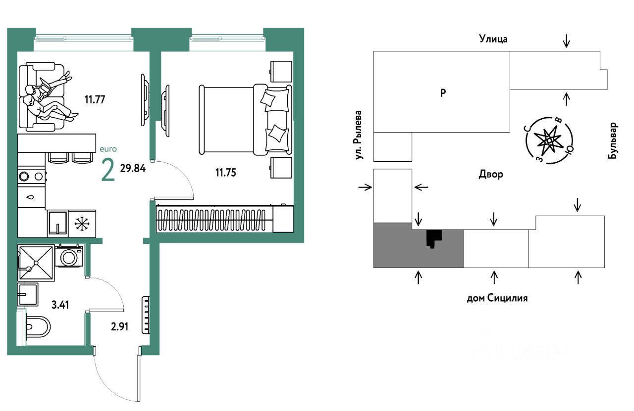 Продается 2комнатная квартира на 5 этаже от застройщика Страна Девелопмент. Площадь квартиры 29,84 кв. м.