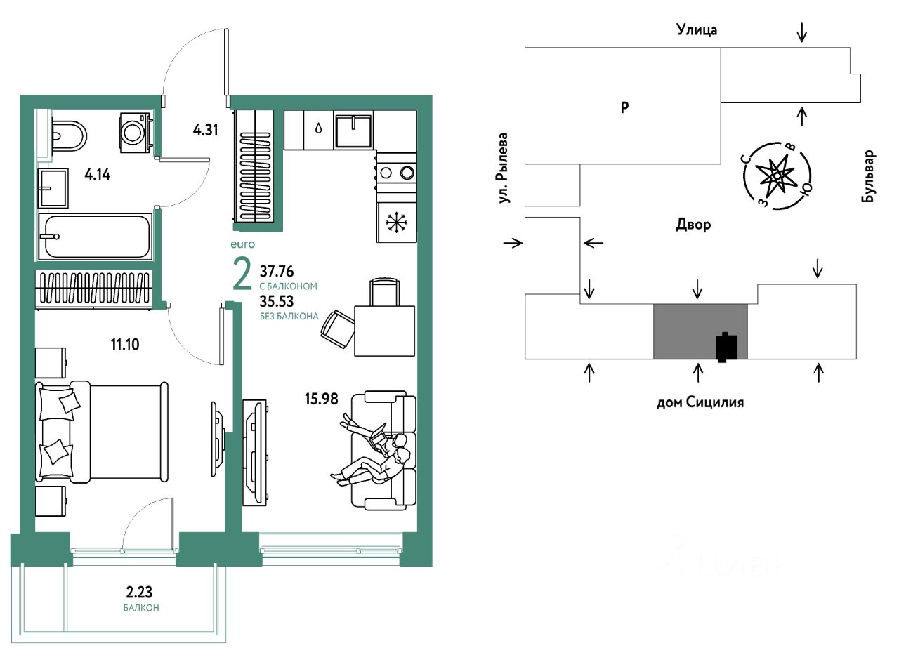 Продается 2комнатная квартира на 7 этаже от застройщика Страна Девелопмент. Площадь квартиры 37,76 кв. м.