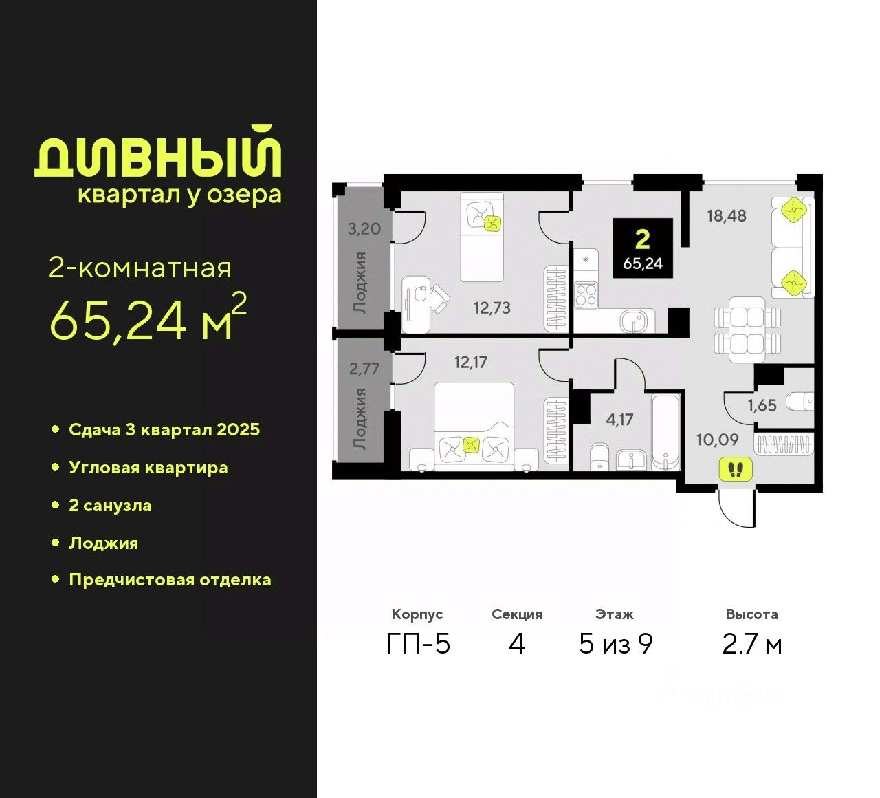 2-комн. квартира от застройщика с предчистовой отделкой в ЖК "Дивный квартал у озера" на 5 этаже. Общая площадь: 65.24 кв.м., жилая: 24.9 кв.м., площадь просторной кухни-столовой: 18.48 кв.м. Угловая квартира, идеально подойдет любителям тишины и панорамных видов. В квартире две лоджии, один совмещенный и один раздельный санузел. Высота потолков 2.7 м.