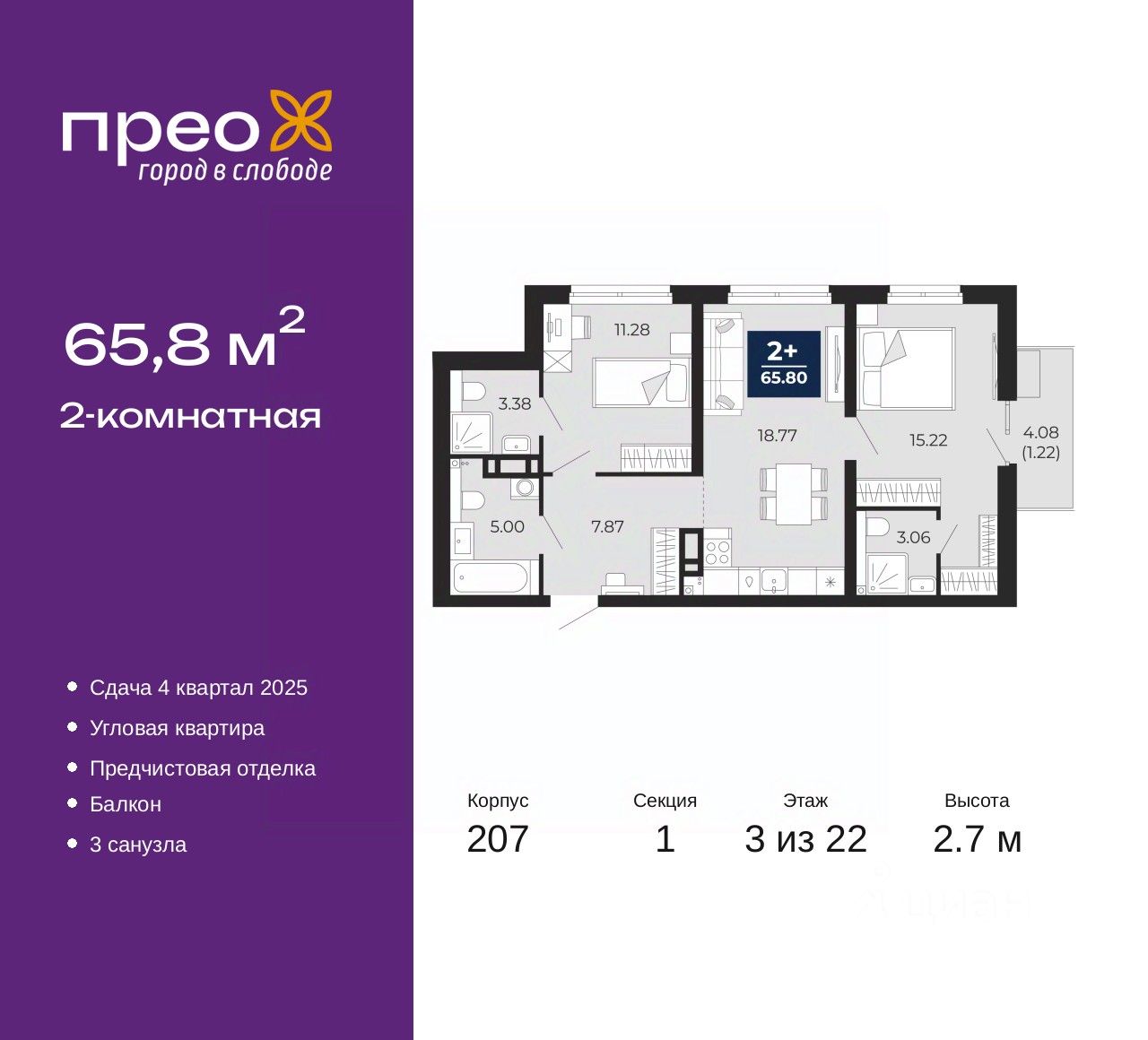 2-комн. квартира с предчистовой отделкой в ЖК "Прео" на 3 этаже. Общая площадь: 65.8 кв.м., жилая: 26.5 кв.м., площадь просторной кухни-столовой: 18.77 кв.м. Квартира угловая, идеально подойдет любителям тишины и панорамных видов. В квартире один балкон, три совмещенных санузла. Высота потолков 2.7 м.