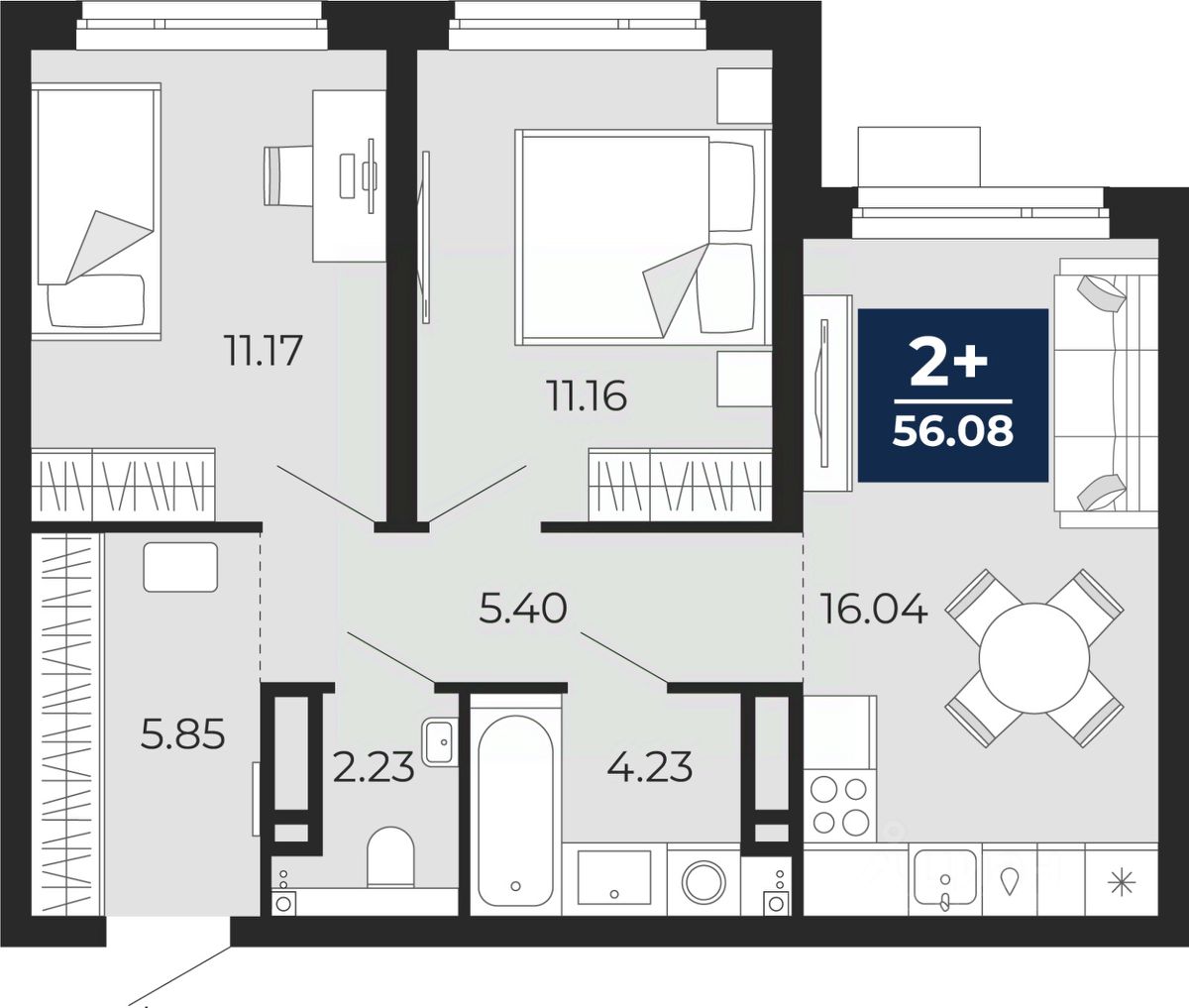 Двухкомнатная квартира с предчистовой отделкой в ЖК "Прео" на 9 этаже. Общая площадь: 56.08 кв.м., жилая: 22.33 кв.м., площадь просторной кухни-столовой: 16.04 кв.м. Комнаты изолированные, все окна выходят на одну сторону. В квартире один раздельный санузел. Высота потолков 2.7 м.