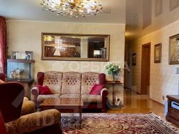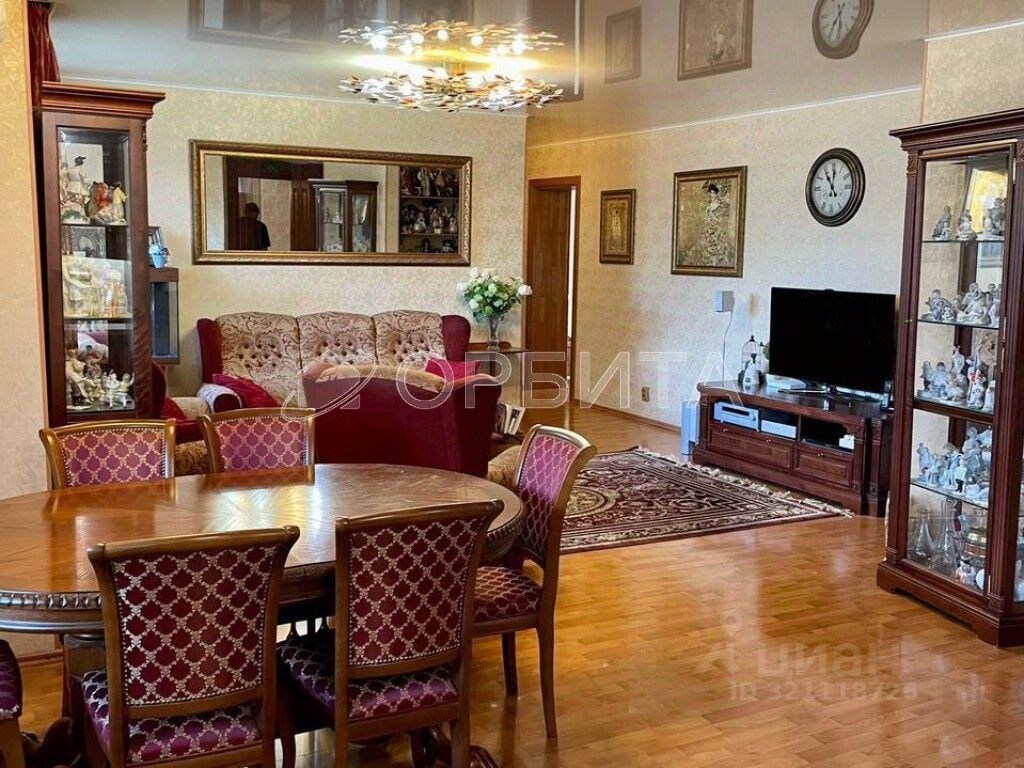 Продается квартира с кухней-гостиной 25 кв.м и 4 раздельными комнатами в центре Тюмени. Кирпичный дом. Хороший ремонт. При продаже остается кухонный гарнитур из массива дерева co встроенной техникой (холодильник, посудомоечная машина, плита, духовой шкаф), полностью обустроенная шкафами гардеробная комната, встроенные книжные шкафы в кабинете, водонагреватель в санузле, кондиционеры в спальне и столовой. Остальная мебель по договорённости. Установлена сигнализация.