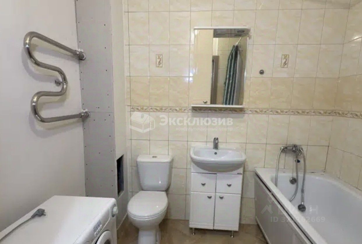 Санузел в кафеле до потолка, установлен унитаз, раковина с тумбой, зеркало с подсветкой, удобная ванна. Есть стиральная машина и полотенцесушитель.